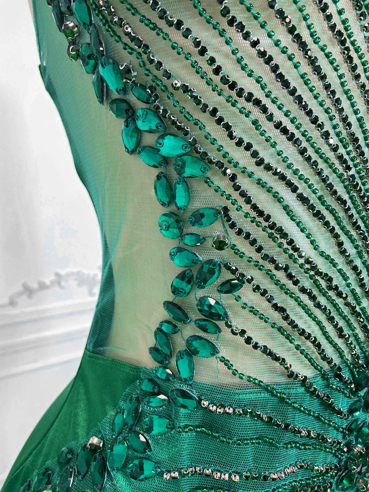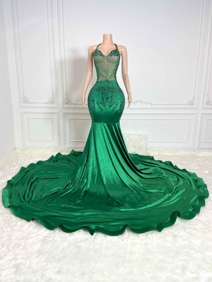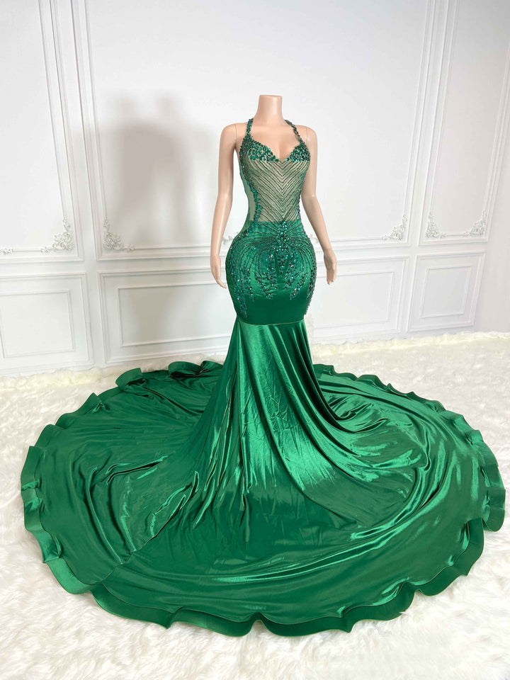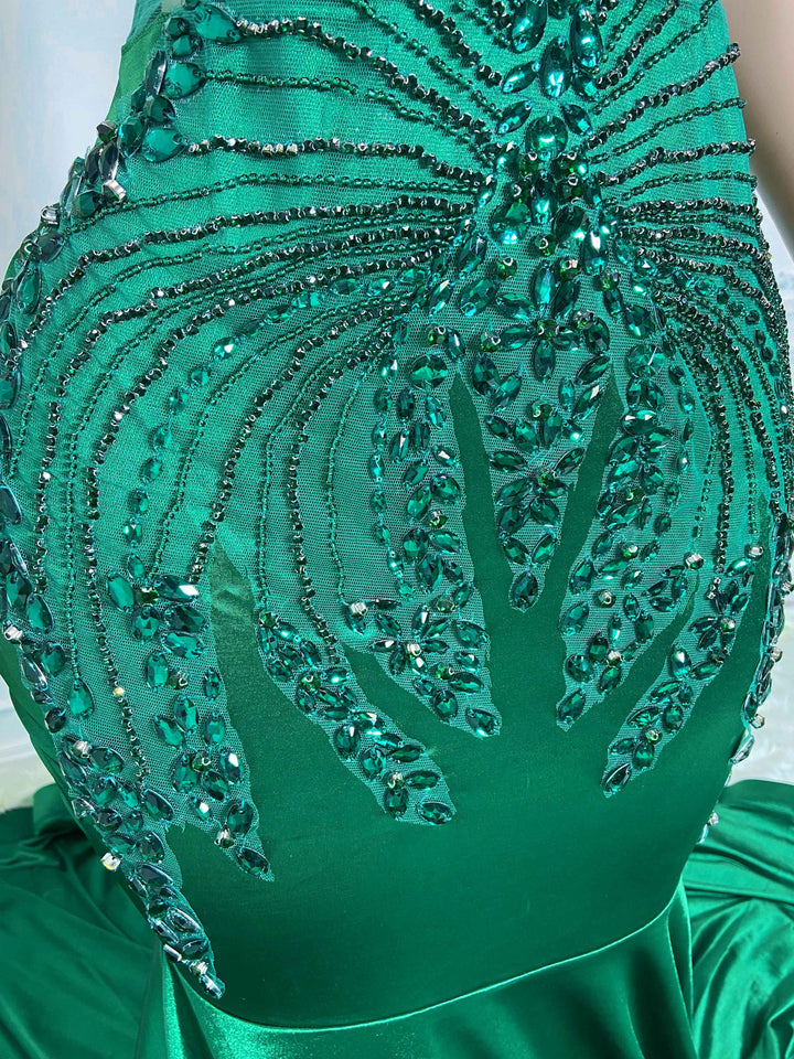 Green Low Cut and Rhinestone Sleeveless Maxi Gown