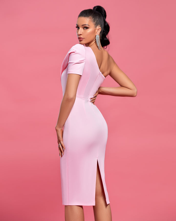 The Suzie Dress designed in a soft candy pink scuba features figure hugging mid-length silhouette with a pleated bodice leading into a draped shoulder detail and sleeve. The Suzie Dress is the essence of elegance and style. Completed with an invisible zipper, this stylish midi is perfect for any formal occasion.