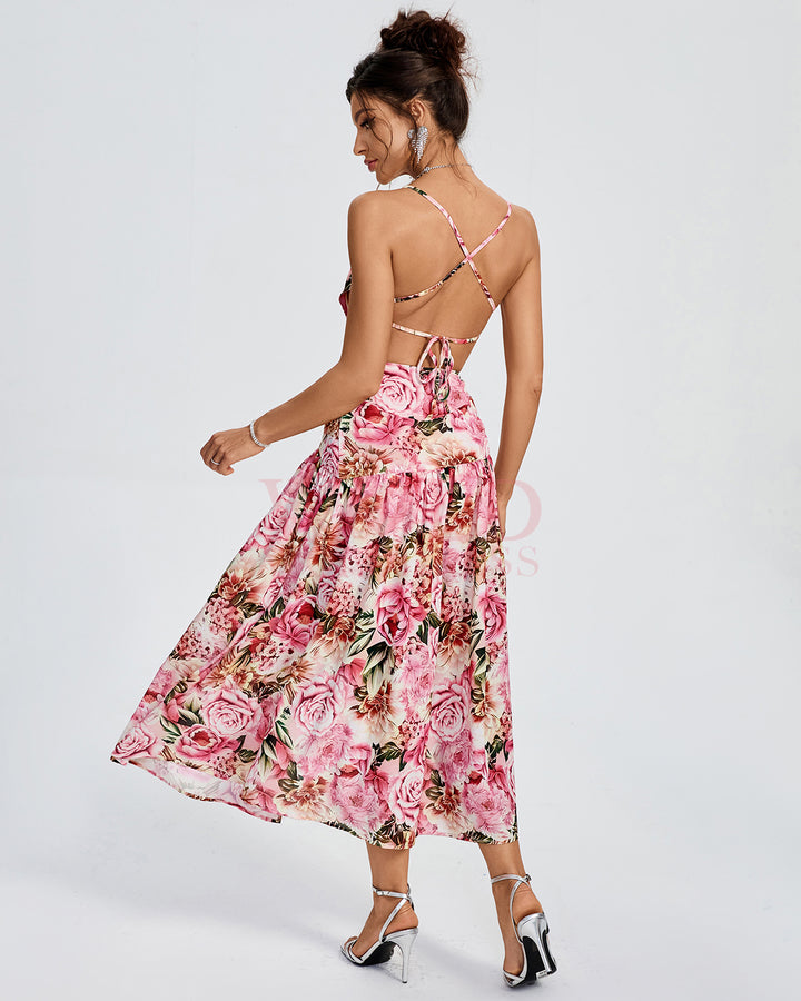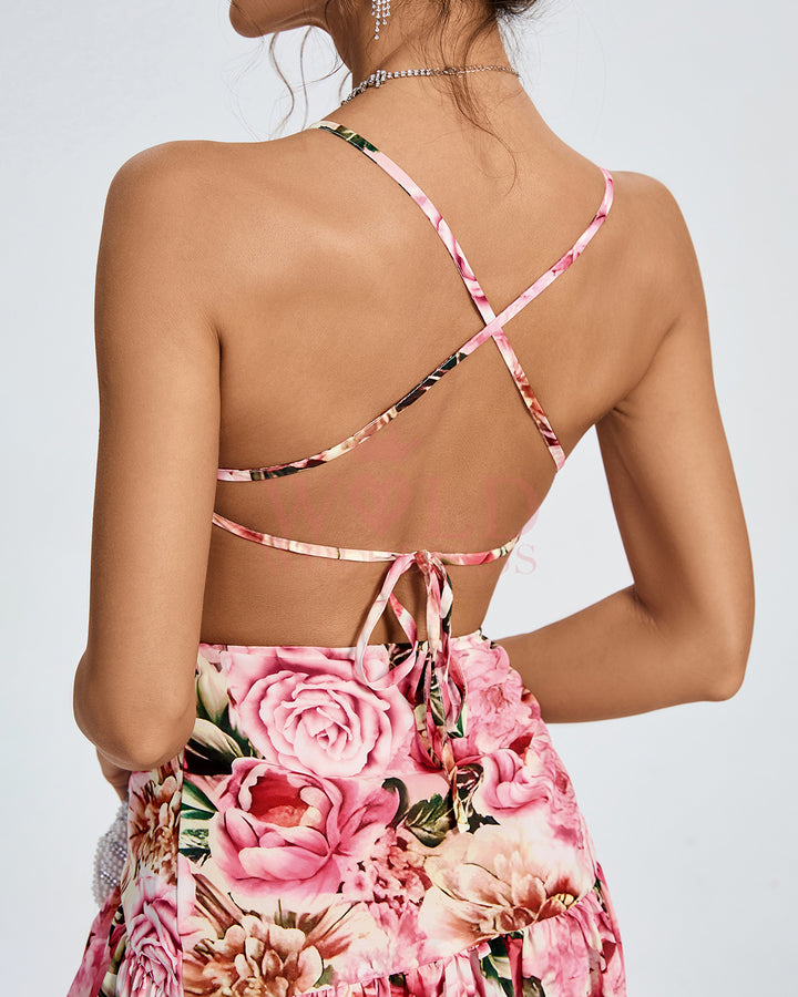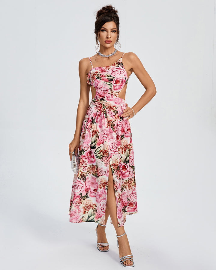Asymmetric Peony Print Backless Dress