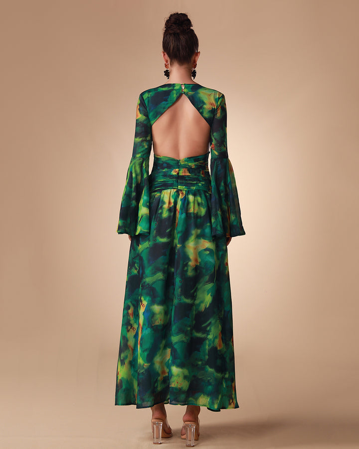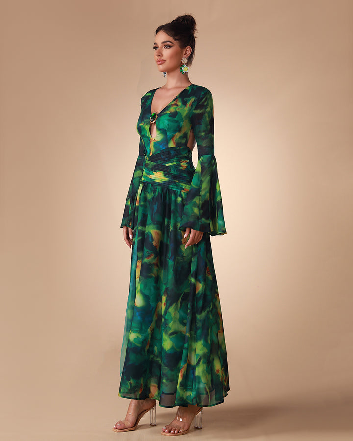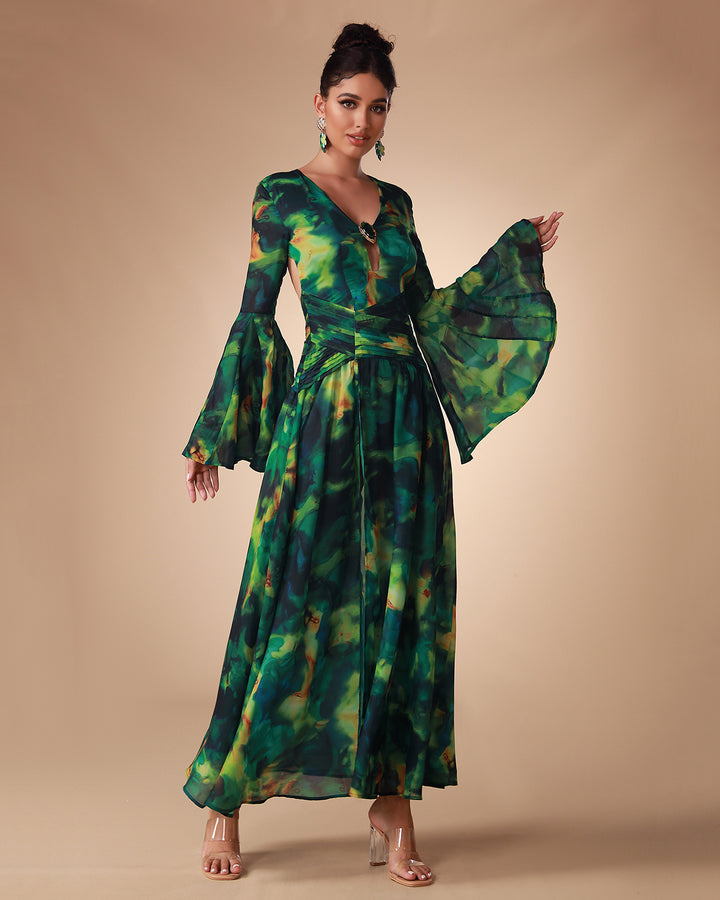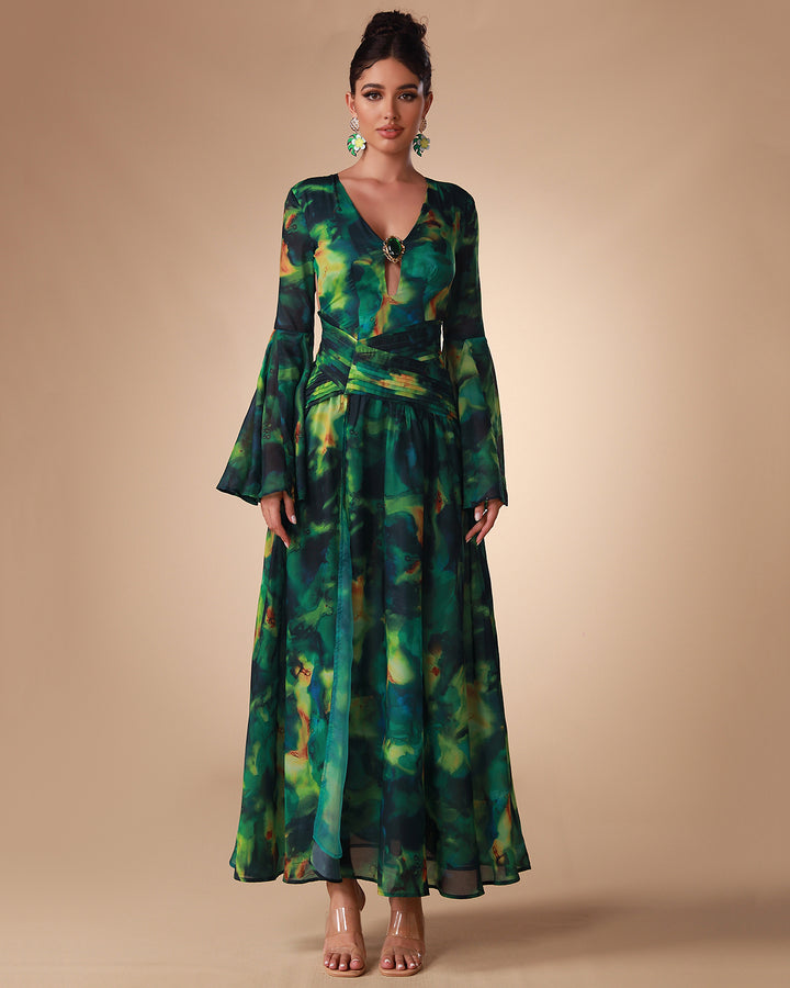 This chiffon maxi dress features a beautiful green floral print and bell sleeves for an elegant look. The cinched waistline flatters the figure and the chest is adorned with rhinestones for a hint of glitz. The lightweight fabric is airy for spring and summer days.