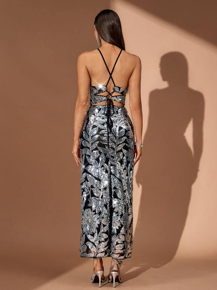 Shine with natural beauty in the Botanical Sequin Open Back Gown, a glamorous piece with floral sequins and a daring open back design, making it one of the most elegant womens dresses for formal occasions.