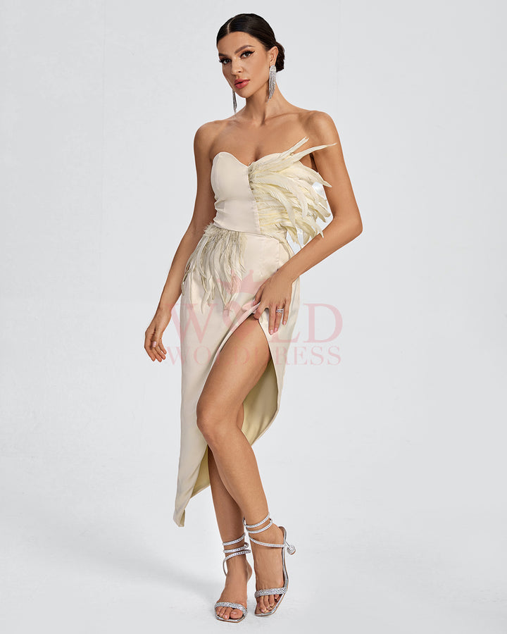 Our Asymmetrical Feather Midi Dress exudes the poise and splendor of feathers, making it a striking and opulent choice for your wardrobe. The BEIGE color exudes elegance and sophistication, while the feather detailing exudes a touch of extravagance. Featuring a sensual slit and captivating silhouette, this dress is an ideal way to make a statement at any event.