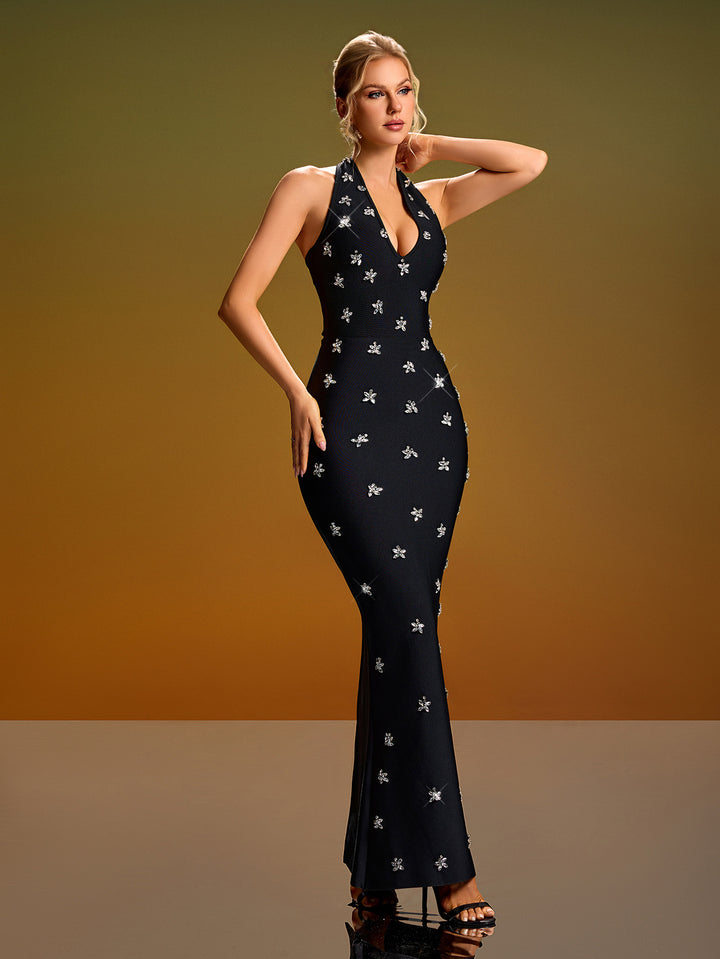The halter rhinestone maxi mermaid dress hugs the body with sparkling charm and a fishtail hem. Designed to enhance your curves with every step, ideal for formal occasions and stylish events.