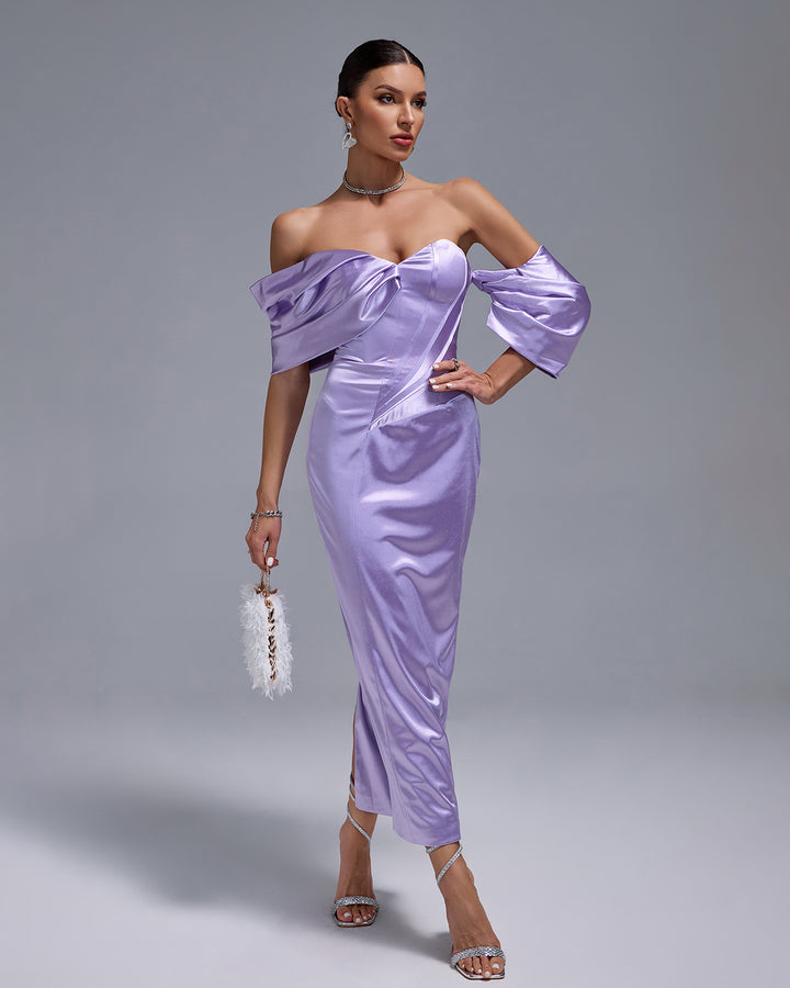 Get ready to turn heads in our Lavender Satin Off Shoulder Midi Dress! Made with luxurious satin fabric, this dress features an elegant and flattering off-shoulder neckline that adds a touch of glamour to any occasion. Perfect for date nights, weddings, and special events, this dress will make you feel confident and stylish.