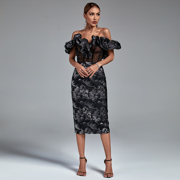 Off Shoulder Pleated Midi Elegant Bodycon Dress