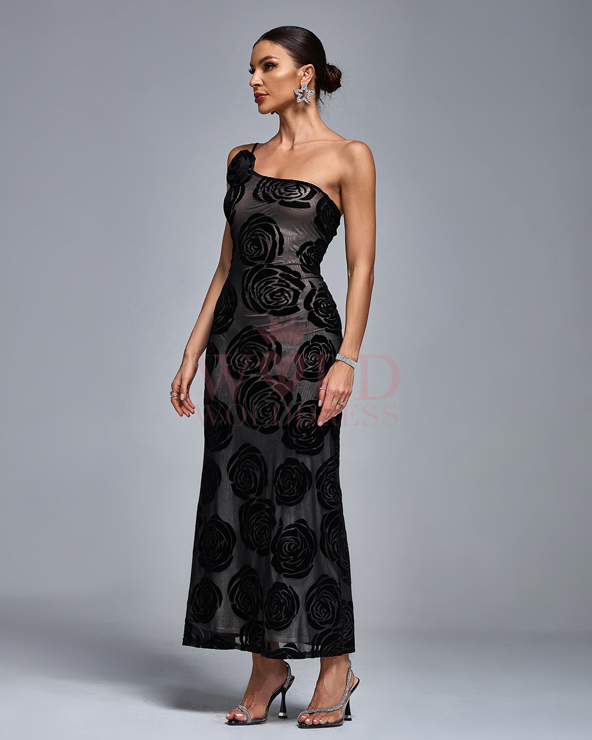 One Shoulder 3D Floral Burnt Flocking Maxi Dress