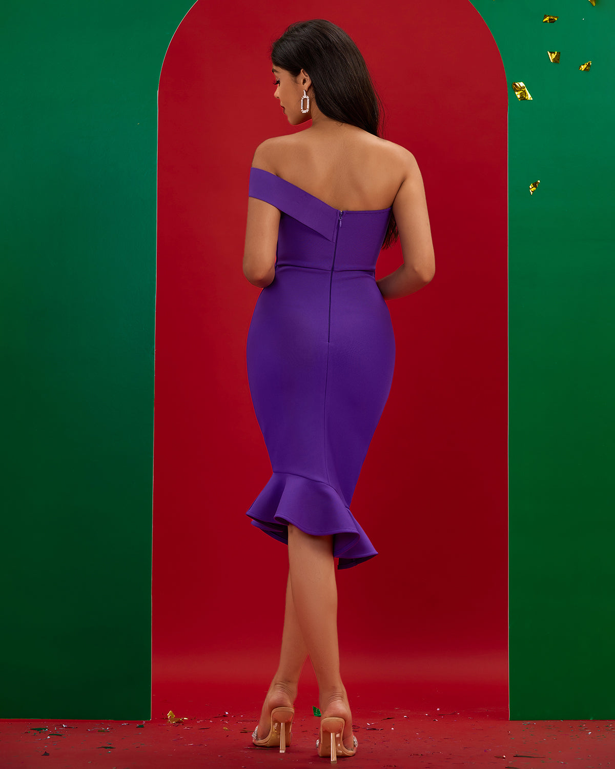Effortlessly make a statement in this One Shoulder Fishtail Midi Bandage Dress. The sleek, figure-hugging design accentuates your curves while the one-shoulder style adds a touch of elegance. Perfect for any formal occasion, this dress is both stylish and sophisticated.