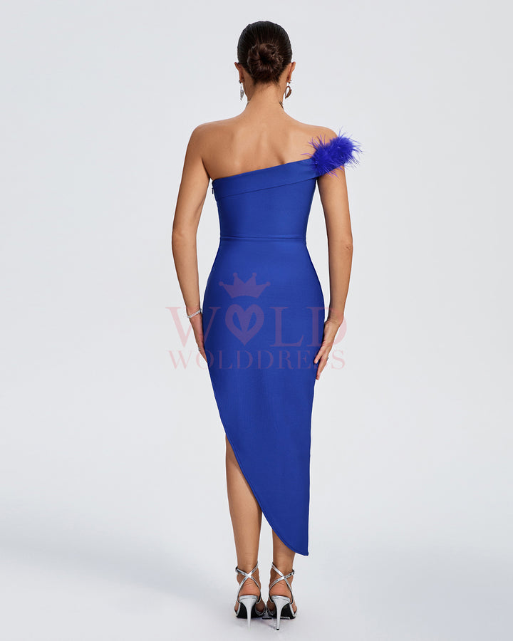 Elevate your style in our luxurious Off Shoulder Feather Trim Bandage Dress. The elegant blue hue complements the feather trim detailing, creating a sophisticated and exclusive look that is sure to turn heads. Made from high-quality bandage material, this dress hugs your silhouette for a perfect fit.