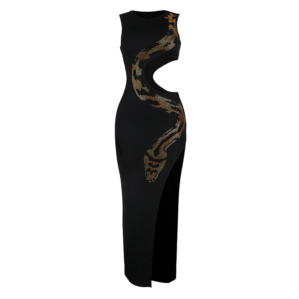 Round Neck Sleeveless Snakelike Rhinestone Maxi Dress