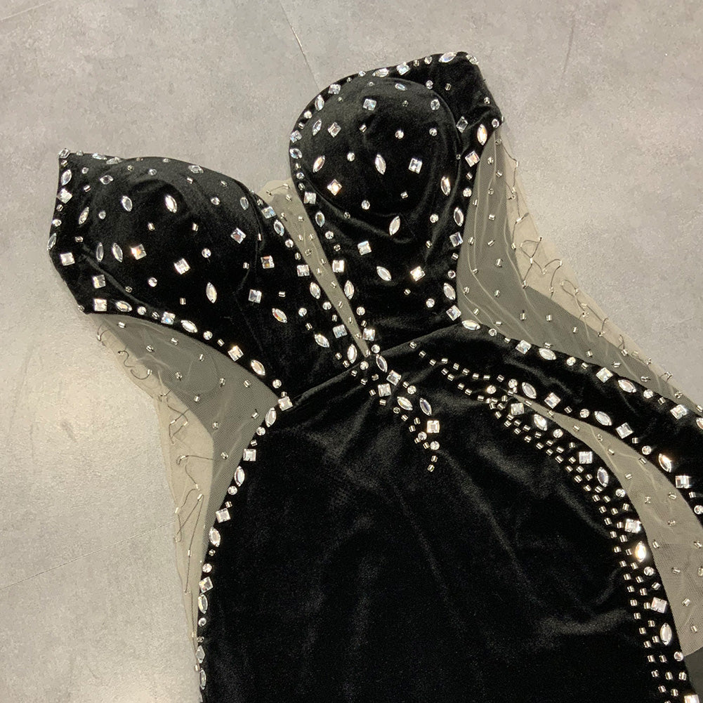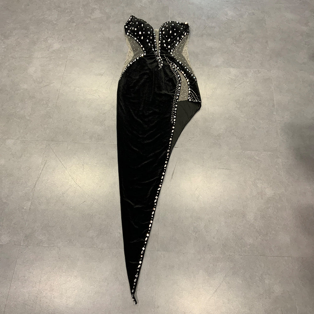 Strapless Rhinestone&Mesh Maxi Bodycon Dress HT2779