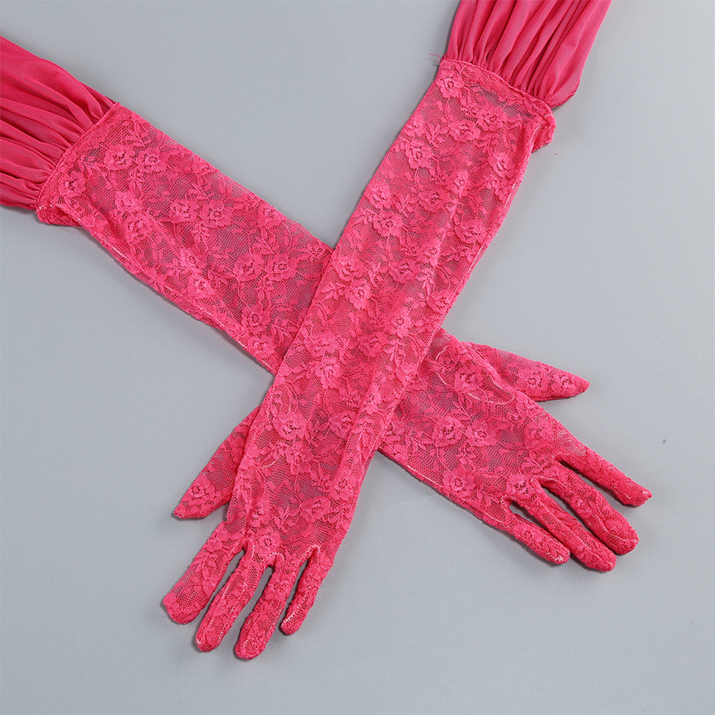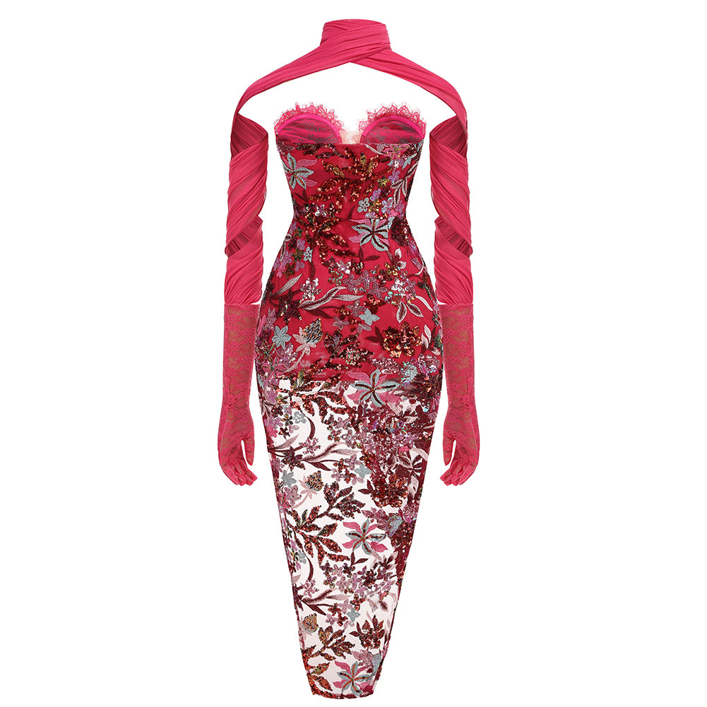 Indulge in the allure of our mesh corset embroided dress, effortlessly elegant with a high low design and added gloves. Delicate flower embroidery enhances the glamorous appeal, making you the center of attention. Embrace your inner confidence and turn heads at any occasion.