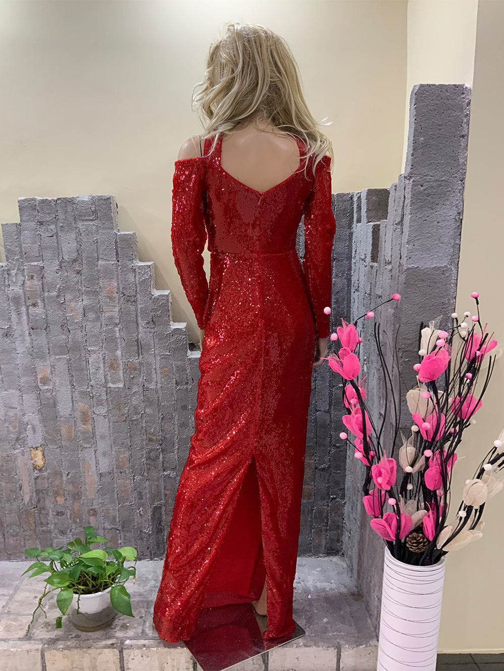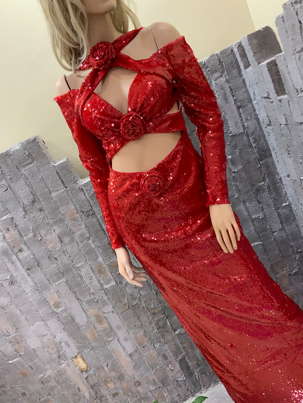 Strappy Long Sleeve Sequined Roses Maxi Bodycon Dress HT20360