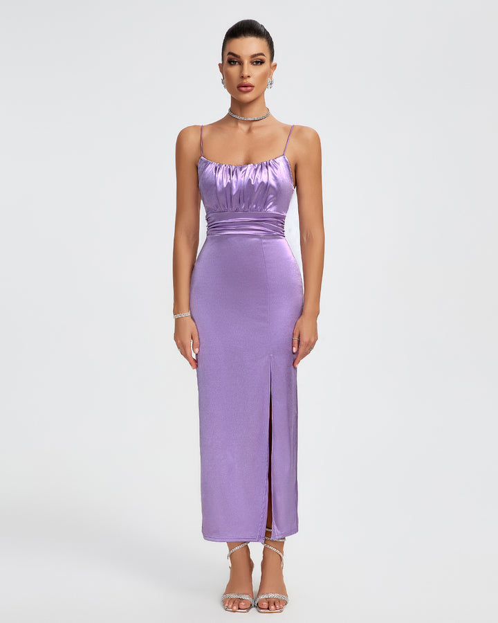 Elegant yet comfortable, this Strappy Satin Fabric Pleated Long Dress is perfect for any special occasion. The flowy fabric and delicate pleats provide a flattering fit, while the strappy design adds a touch of modern style. Make a statement and feel confident in this stunning dress.