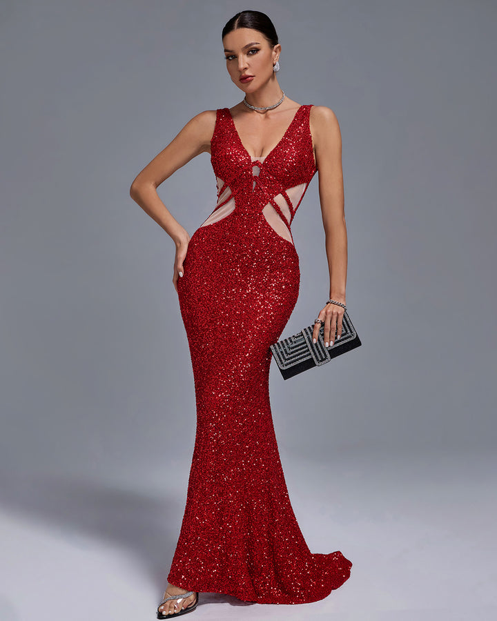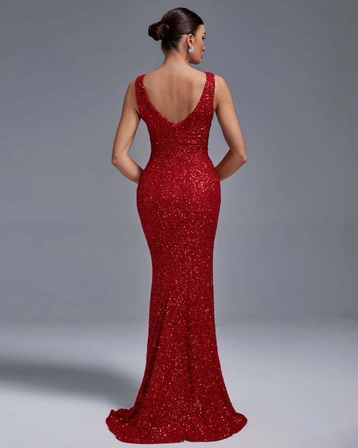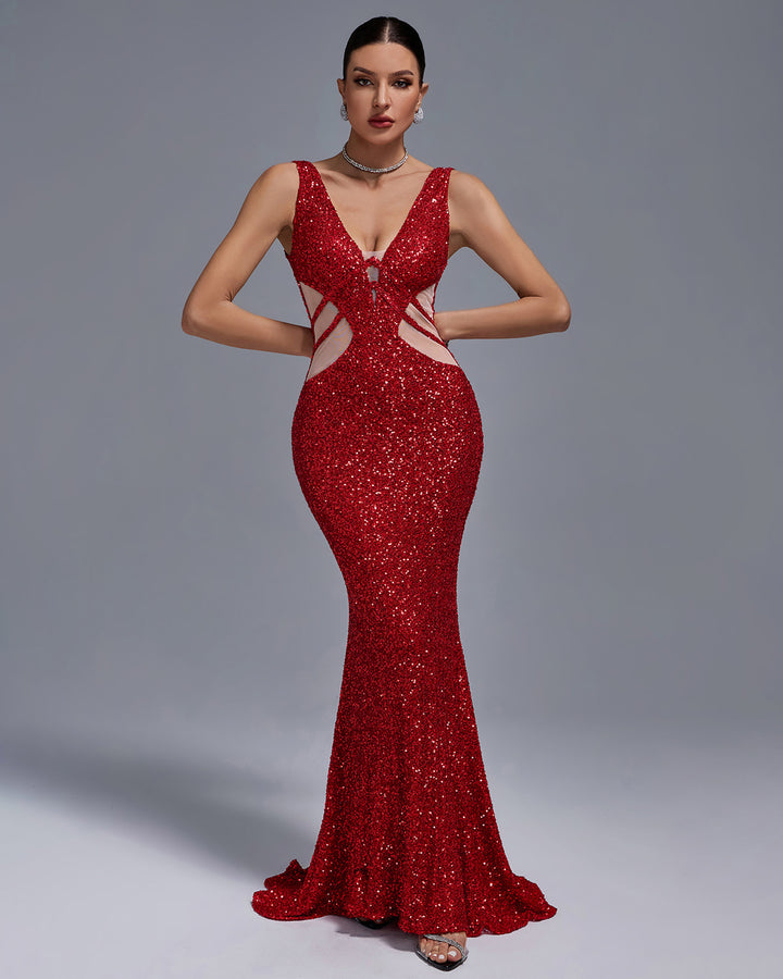 Dazzle in our V Neck Sequins Mermaid Dress! With its stunning V-neckline and sparkly sequins, this dress will make you feel like a goddess. Its figure-hugging mermaid silhouette will accentuate your curves, making you the center of attention. Perfect for any special occasion, this dress will make you shine!