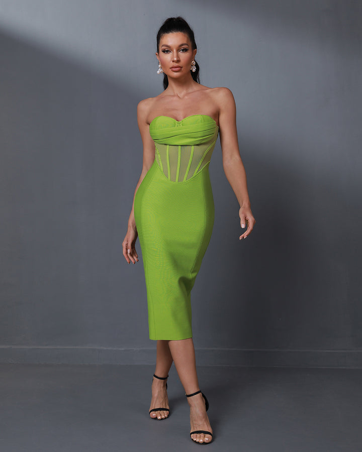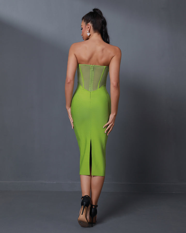 Stylish and modern, this Backless Mesh Bandage Midi Dress is perfect for any special occasion. The bandage top provides a flattering and comfortable fit, while the mesh detailing adds texture and brings attention to the back. This dress is sure to become a go-to in your wardrobe.