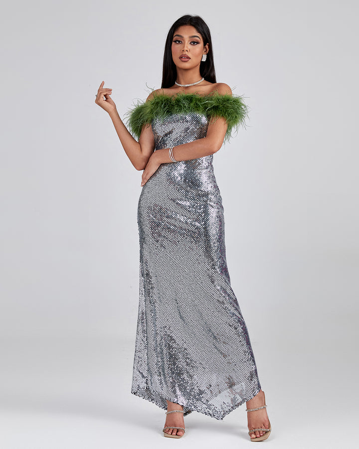 Give your evening look an alluring sparkle with the Off Shoulder Feather Sequin Maxi Dress. A sophisticated piece with an off the shoulder neckline and glittering sequins, this dress is perfect for making a statement. Its luxurious feather pattern seamlessly blends the design with a hint of glamour. Let its subtle drama and artful transitions of light put you in the limelight.