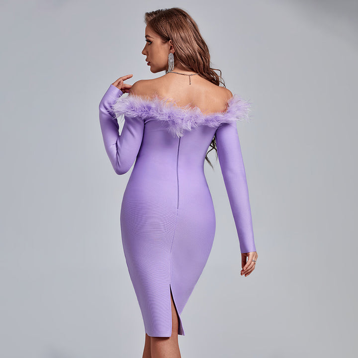 Take a stylish risk in this Off Shoulder Feather Over Knee Bandage Dress. Show off your adventurous side with this daring off-shoulder cut and on-trend feather detailing. Make a statement and take control of your look - it's time to fly!