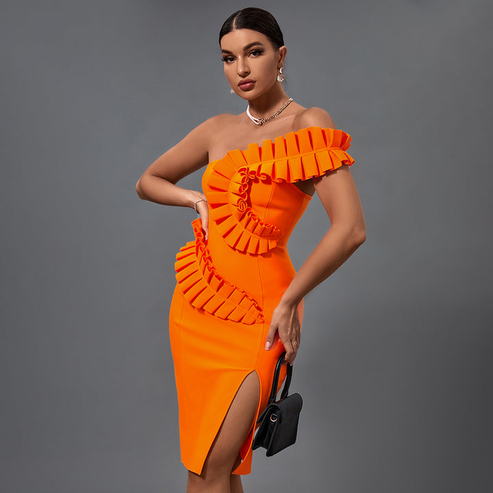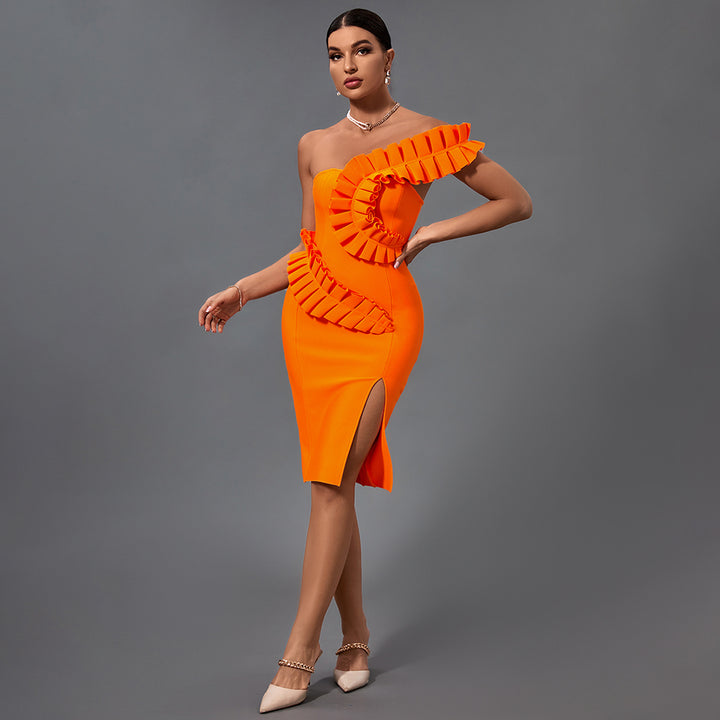 This classic one shoulder dress is perfect for special occasions. The embellishments add a subtle elegance to the bandage dress, making it the ideal choice for any formal event. With a comfortable fit and beautiful detail, you'll shine in this amazing dress.