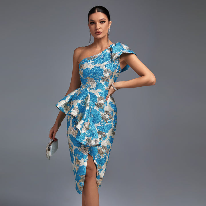 Exuding sophistication and class, this Slanted Shoulder Slit Midi Bodycon Dress is the perfect choice for a night out. Its slanted shoulder and midi length flatter every body type, while the bodycon silhouette adds an understated elegance. Enjoy an evening out wearing this elegant, stylish piece.