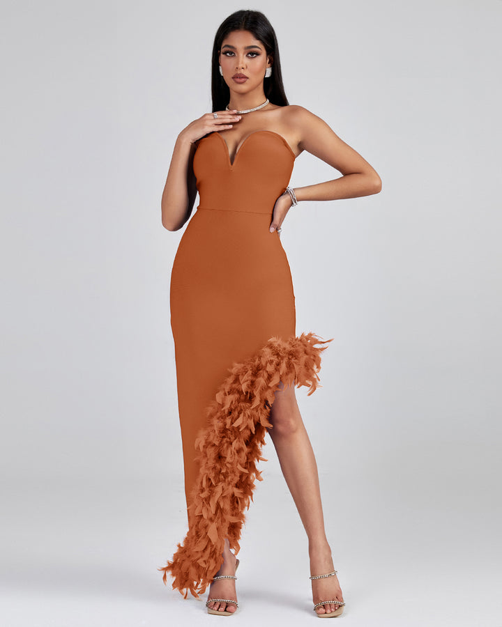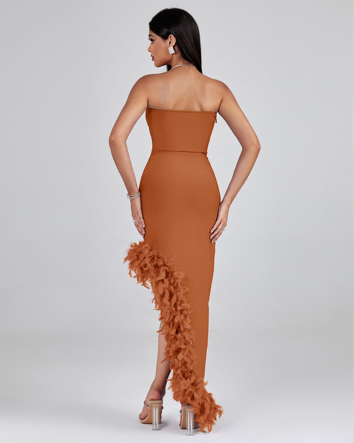 Add a touch of glamour to your wardrobe with our Strapless Feather Trim Bandage Long Dress! The strapless design allows for a flattering silhouette, while the feather trim adds a playful and unique element to this elegant dress. Perfect for any formal event, this dress is sure to make a statement and turn heads.