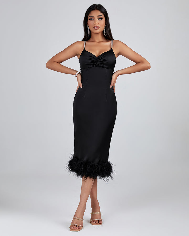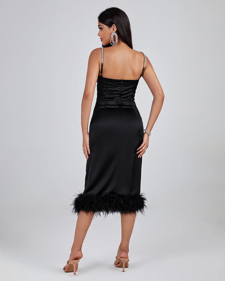 Experience sumptuous elegance with our Strappy Backless Feather Trim Midi Dress. Crafted from luxurious fabric, it features a delicate feather trim and a strappy backless design, creating a sophisticated silhouette fit for a modern goddess. Enjoy a taste of old-school glamour with our statement-making dress.