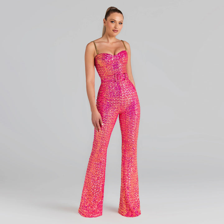 Achieve a glamorous look in this Strappy Sleeveless Chain Bodycon Jumpsuit. With intricate straps and a dazzling chain detail, it's perfect for making a statement this season. Want to turn heads? This jumpsuit is your answer!